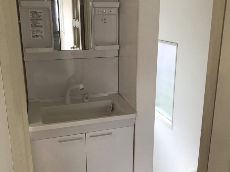 もともと物入れだったところに洗面台を設置いたしました。 給排水はエアコンの配管カバーで隠しています。