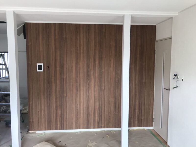 もともと廊下だったところを壁を抜いてリビングを広くしています。 建具も位置を変えて新しくしました。 抜けない柱は白い木目のクロスをまいています。